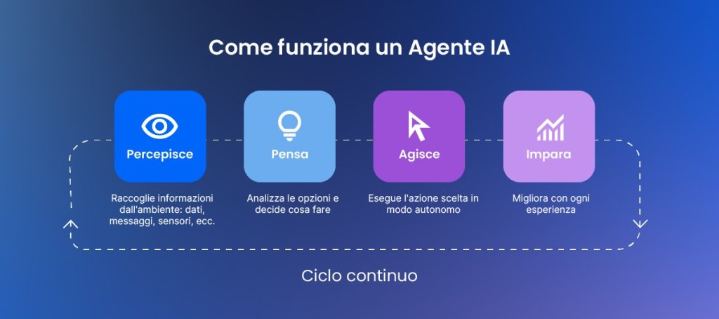Un Agente IA funziona seguendo un ciclo che si ripete continuamente: percepisce, ragiona, agisce e apprende.